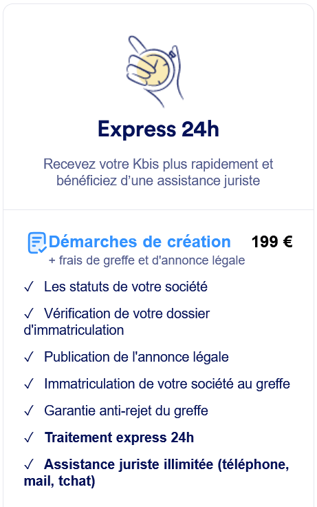 - Express 24h : Pour 199€, vous bénéficiez des services classiques avec une garantie anti-rejet, mais aussi d’un traitement express sous 24h, et une assistance juridique illimitée.