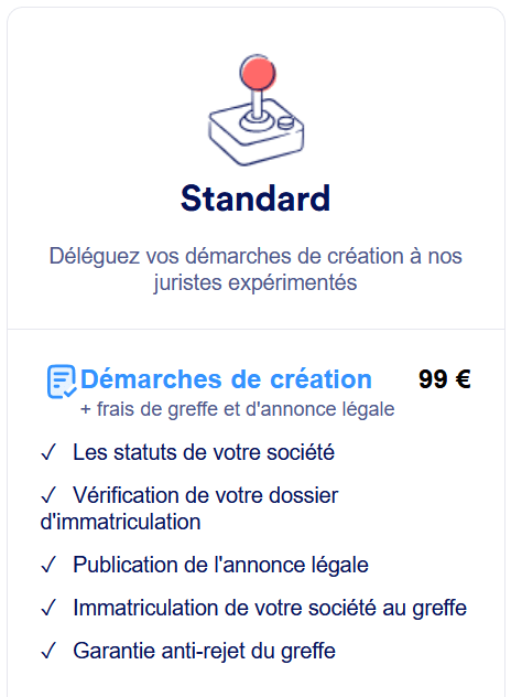 - Démarches de création de société : À partir de 99€, cette offre inclut la rédaction des statuts, la vérification du dossier d’immatriculation, la publication de l’annonce légale, et l’immatriculation de la société au greffe.