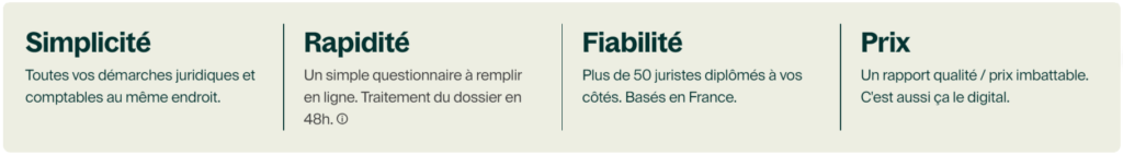 Une solution digitale qui permet aux entrepreneurs de gérer facilement toutes les étapes liées à la création et la gestion d’entreprise. Contrairement à un cabinet d’avocat classique, La plateforme se distingue par des prix competitifs, une rapidité de traitement et un accompagnement personnalisé. Avec plus de 750 000 entrepreneurs accompagnés, une référence en France pour les démarches juridiques en ligne.